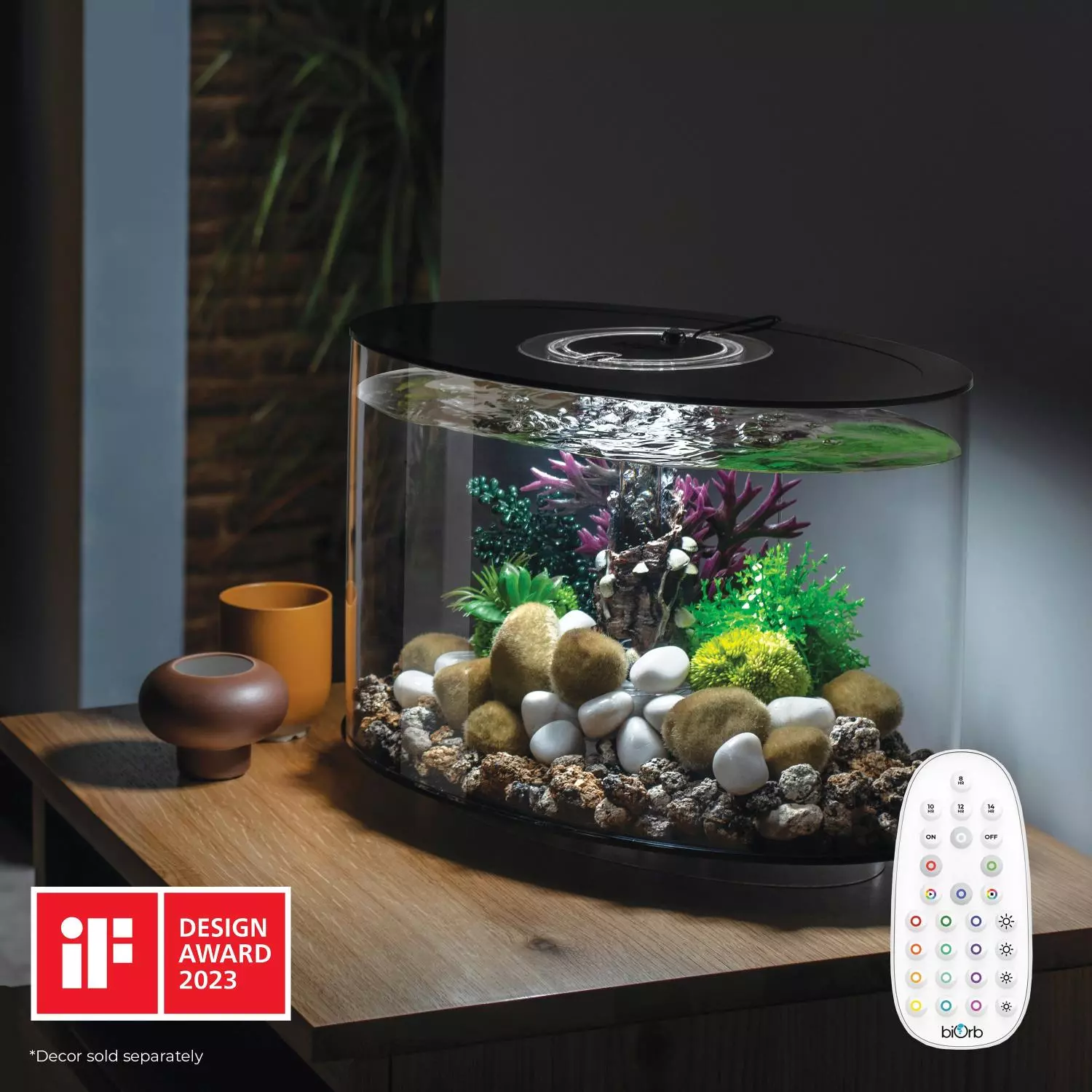 - Patentert filtreringssystem – Alle biOrb-akvarier har et ekte 5-trinns filtersystem med biologisk, mekanisk, kjemisk filtrering, vannstabilisering og oksygenering. Filteret er plassert i bunnen, og det keramiske mediet fremmer vekst av nyttige bakterier.