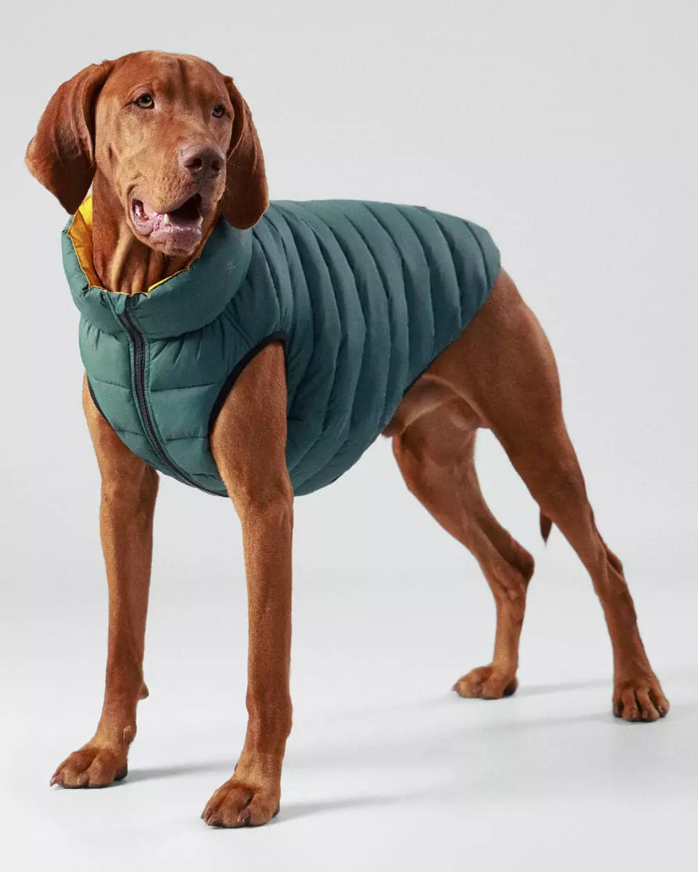 Den vendbare puffer-jakken lar deg enkelt variere uttrykket, og gir to stilrene sider i én og samme jakke. Materialet er både vindavvisende og vannavstøtende, slik at turene blir mer komfortable for hunden – uansett vær. Jakken har en praktisk åpning ved nakken slik at kobbelet kan festes direkte i halsbåndet.